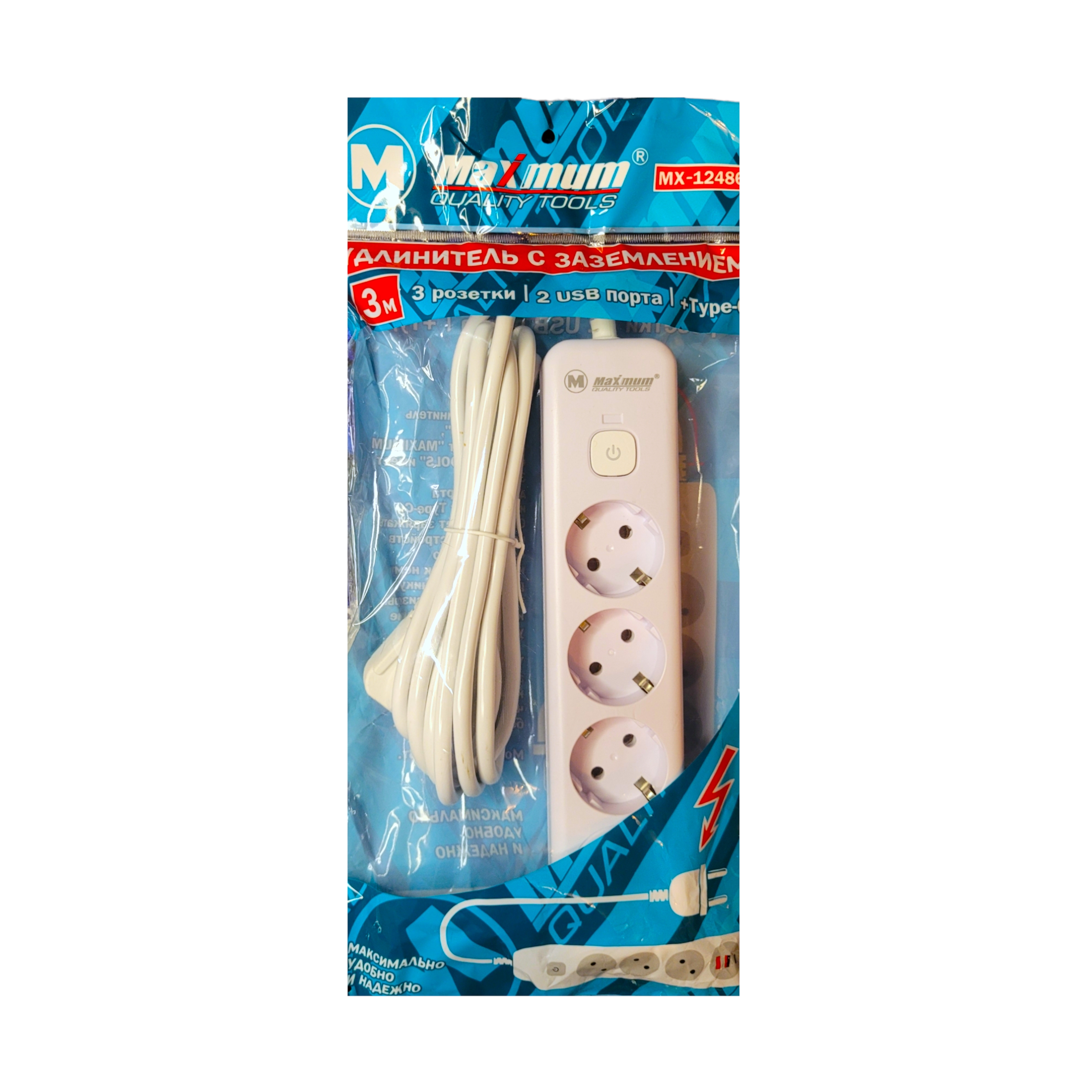 Удлинитель с заземлением 3 м, 3 розетки, 2 USB порта, Type C, "MAXIMUM" MX 12486 (2585)