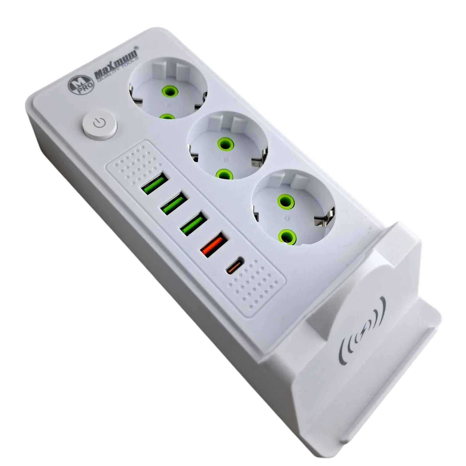 Удлинитель электрический с беспроводной зарядкой 5 метров от "Maximum Quality Tools" оборудован тремя розетками евро типа с заземлением, а также 4 USB портами и входом Type C.