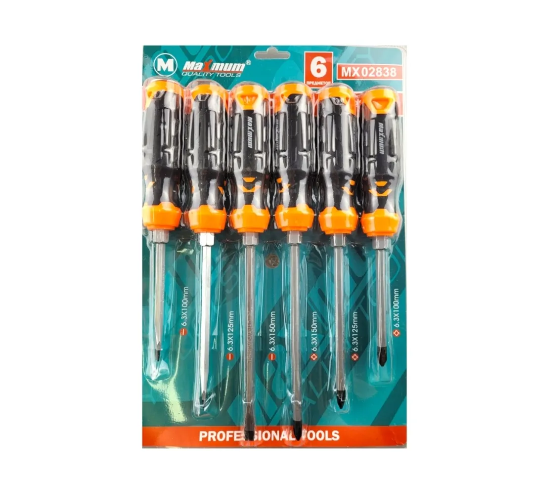 Набор отверток ударно-поворотных выполнен из высоколегированной хром-ванадиевой стали. Сквозной Cr-V стержень создан с внешним шестигранным усилителем под ключ для передачи большего усилия.Стальной стрежень и рукоять имеют идентификационные надписи, позволяющие быстро найти нужный инструмент.Магнитные наконечники помогают захватывать болты прикосновением отвертки и доставать укатившийся крепеж из труднодоступных мест. Двухкомпонентные рукоятки снижают нагрузку на кисть благодаря ребристой резиновой вставке, исключающей скольжение отвертки в руке.