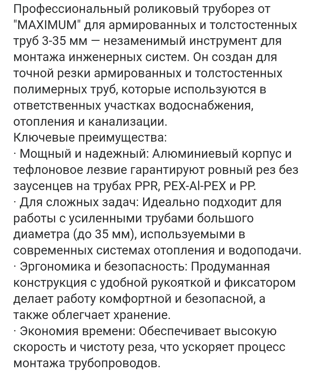 Труборез усиленный для толстостенных пластиковых труб 3-35 мм,"MAXIMUM" MX 16958