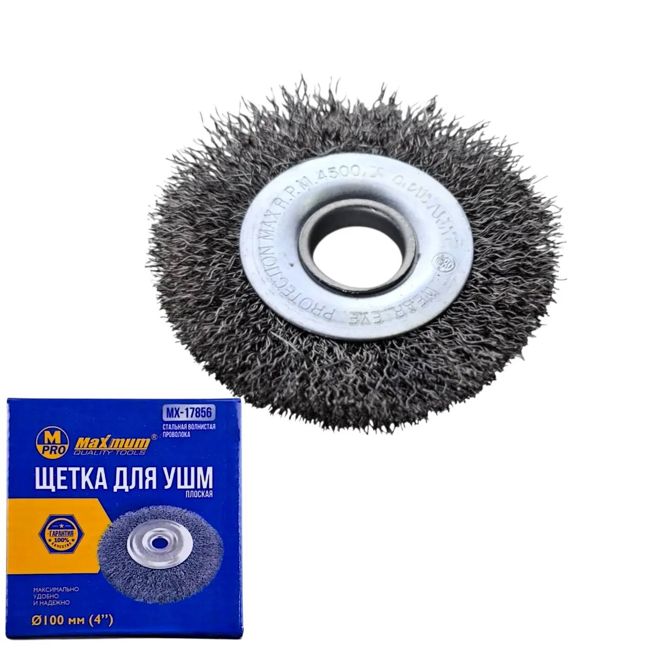 Щетка дисковая для УШМ (болгарки) 100 мм от "Maximum" создана для грубой очистки металла. Стальная проволока эффективна против стойких загрязнений. Максимальная рабочая скорость составляет 13 000 об/мин. Щетка дисковая (кордовая) для болгарки Maximum, 100 мм (4"), плоская, волнистая проволока, посадка 22.2 мм. Плоская щетка-корд для УШМ (болгарки) диаметром 100 мм от бренда Maximum предназначена для интенсивной зачистки и грубой очистки металла. Изготовлена из качественной волнистой стальной проволоки для эффективного удаления ржавчины, окалины и стойких загрязнений. Имеет стандартную посадку M14 (22.2 мм) и рассчитана на скорость до 13 000 об/мин. Идеальна для подготовки поверхностей перед сваркой или покраской.