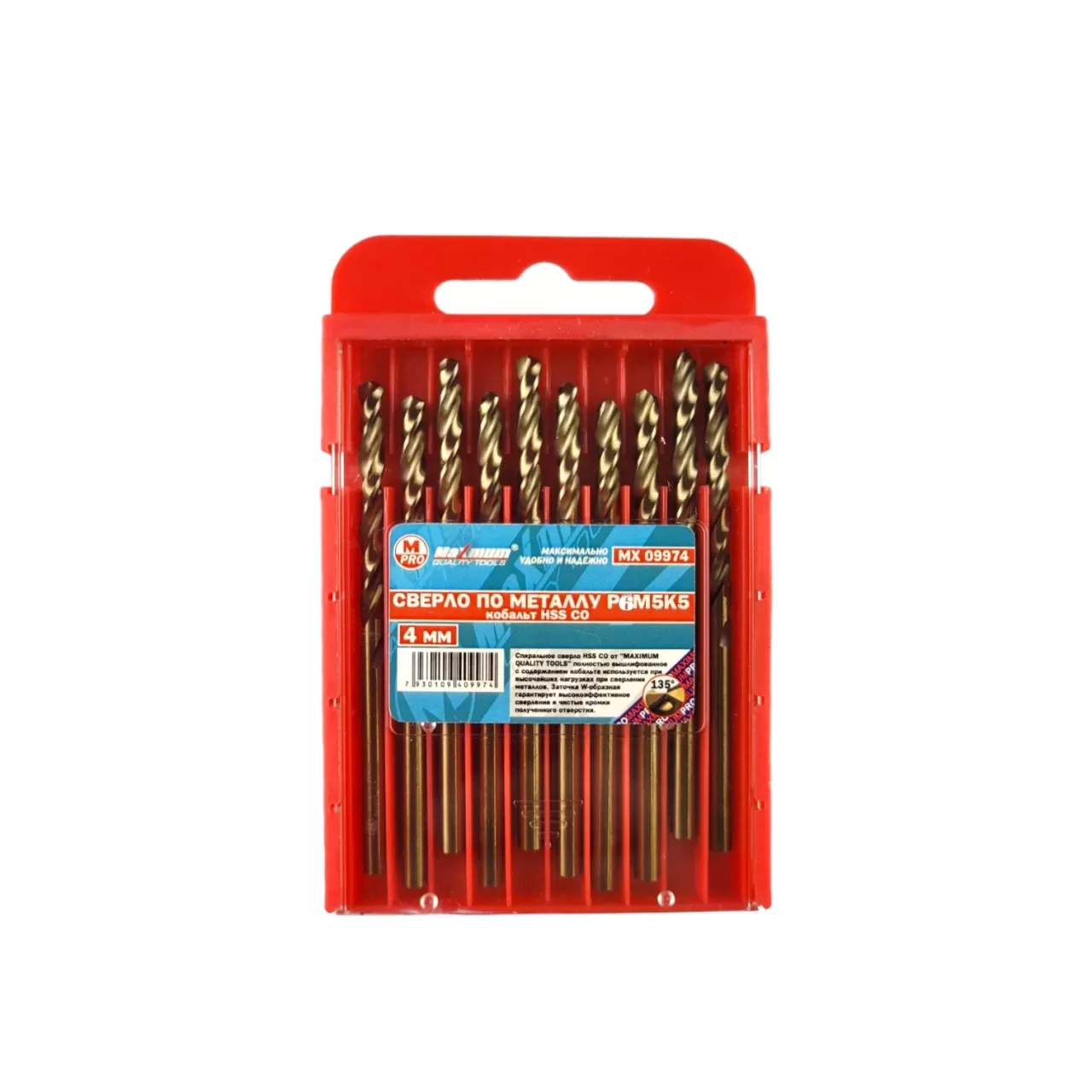 Сверла по металлу кобальтовые 4 мм, 10 шт., HSS CO, P6M5K5, "MAXIMUM" MX 09974